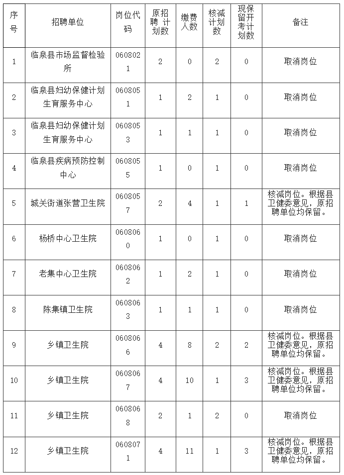 2024年度临泉县事业单位公开招聘报名后核减或取消招聘计划岗位表